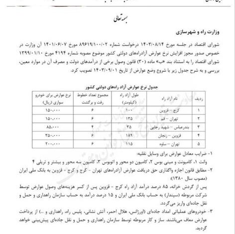 بر اساس مصوبه شورای اقتصاد، نرخ عوارض آزادراه کرج – قزوین به طول ۱۰۰ کیلومتر ۱۵ هزار تومان، نرخ عوارض آزادراه تهران – قم به طول ۱۳۵ کیلومتر ۱۵ هزار تومان، آزادراه بندرعباس – شهید رجایی به طول ۳۵ کیلومتر ۸۵۰۰ تومان، آزادراه قزوین – زنجان به طول ۱۸۹ کیلومتر ۳۵ هزار تومان و عوارض آزادراه تهران – ساوه به طول ۱۱۵ کیلومتر ۲۰ هزار تومان تعیین شده است.