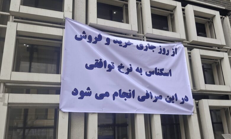 سراغ صرافی ملی رفتیم این بار انگار قرار بود دست پر برگردیم همین که نزدیک صرافی ملی شدیم با بنری بزرگ مواجه شدیم که روی آن نوشته شده بود: از روز جاری خرید و فروش اسکناس به نرخ توافقی در این صرافی انجام میشود.