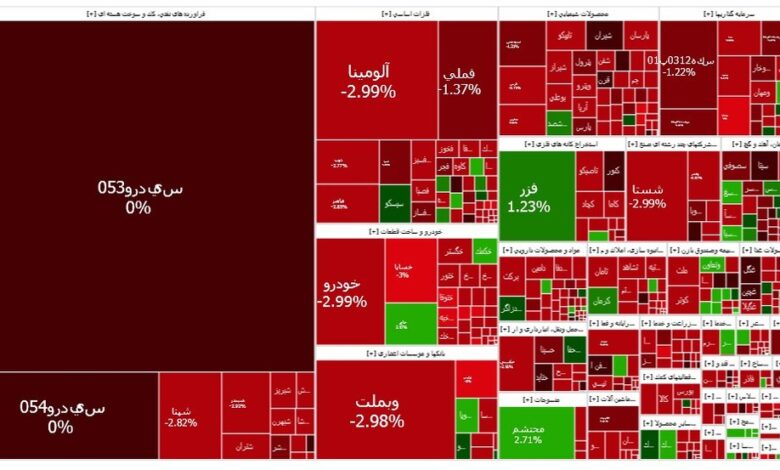 فارس، فملی و وبملت بیشترین تاثیر منفی را بر شاخص بورس داشتند. از نمادهای پرتراکنش نیز میتوان به آلومینا، وبملت و محتشم اشاره کرد.