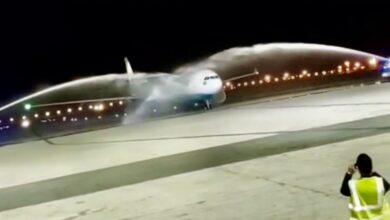 استقبال از نخستین هواپیمای عربستانی در فرودگاه امام(ره) | لحظات آبپاشی بر روی ایرباس پهن پیکر + فیلم