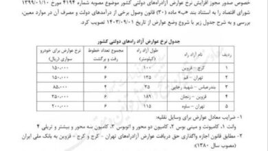 نرخ عوارض ۵ آزادراه دولتی تغییر کرد/ تهران – قم ۱۵ هزار تومان