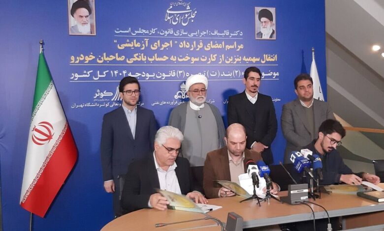 به گزارش همشهری آنلاین به نقل از ایرنا، امروز سهشنبه( ۱۴ اسفندماه) و در مراسمی که در مجلس شورای اسلامی انجام شد، قرارداد اجرای آزمایشی انتقال سهمیه بنزین از کارت سوخت به حساب بانکی صاحبان خودرو امضا شد.
